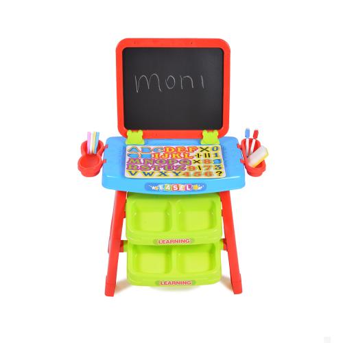 Комплектът включва цветни маркери, тебешири, магнитни знаци, цифри и букви, както и удобни поставки за съхранение.